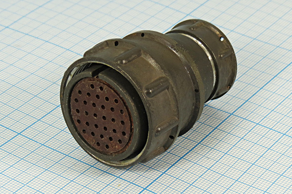 З'єднувач 2РМТ30КПЕ32Г1В1В циліндричний низькочастотний тропікостійкий з нарізною фіксацією зчленованого положення. Призначений для роботи в електричних ланцюгах постійного та змінного струмів частотою до 3 МГц за напруги 560 або 700 В залежно від типономінулу. Використовуються для з'єднання й роз'єднання електричних ланцюгів (проводів, кабелів, вузлів і блоків) у різних типах електро- та радіоапаратури спеціального та загального призначення. З'єднувачі 2РМТ виготовляються восьми конструктивних виконань по 15 типономінів кожного виконання, лише 825 типоконструкцій. З'єднувачі складаються з двох частин: вилки та розетки. Вилки та розетки можуть бути як приладовими (блоковими), так і кабельними. Приладна частина з'єднувачів виготовляється без патрубків або з прямими патрубками, кабельна частина без патрубків, з прямими або кутовими патрубками. Зчування з'єднувачів — нарізне, поляризація корпусів одношпонкова. Покриття контактів — золото або срібло. Метод монтажа - пайка. Призначені для монтажу з екранованими або неекранованими кабелями (проводами) водночас змінюється вигляд кінцевої гайки патрубка. Маркуються цифро-букванним кодом на корпусі з'єднувача. Виготовляються для внутрішнього монтажу у всекліматичному виконанні В2.1 за ГОСТом 15150-69. Категорія якості: «ОТК», «ВП», «ОС». Технічні умови: - приймання «1» АШДК.434410.062ТУ; - приймання «5» ГЕ0.364.126ТУ; — приймання «9» ГЕ0.364.126ТУ, бР0.364.045ТУ. Гарантійний термін зберігання з'єднувачів 2РМТ — 15 років від дня виготовлення. Гарантійне напрацювання: - 1000 годин у всіх режимах та умовах, що допускаються ТУ; - 100 000 годин у полегшеному режимі. Гарантійне напрацювання обчислюється в межах гарантійного терміну зберігання. Розшифрування умовного позначення: 2РМТ30КПЕ32Г1В1В 2РМТ — тип з'єднувача; 30 — умовний розмір корпусу; До - виду корпусу: К — кабельний, Б — блоковий (приладний); П - вид патрубка: П — прямий, У — кутовий; Е — різновид гайки патрубка: Е — для екранованого кабелю, Н — для неекранованого кабелю; 32 - кількість контактів; Г — частина з'єднувача: Ш - вилка; Г-розетка; 1 — позначення поєднання контактів; В - покриття контактів: А - золото, В - срібло; 1 - теплостійкість 1 - 100 °C; Л — ліва розетка (тільки для прохідних вилок); В — всекліматичне вироблення. ![]() Основні технічні характеристики з'єднувачів 2РМТ: